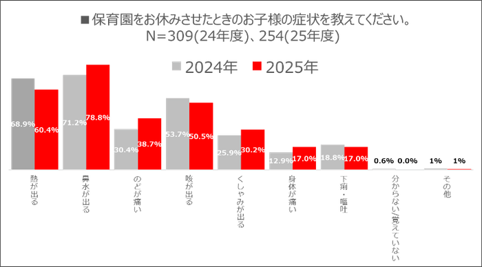 大正製薬㈱が行った調査では、4~6月に保育園をお休みさせた経験がある保護者は8割以上に上り、24年度よりもさらに増加したことがわかった。休ませる原因となった症状トップ3は昨年と同様に「鼻水が出る」、「熱が出る」、「せきが出る」であり、中でも鼻水の割合が高くなっていた。
