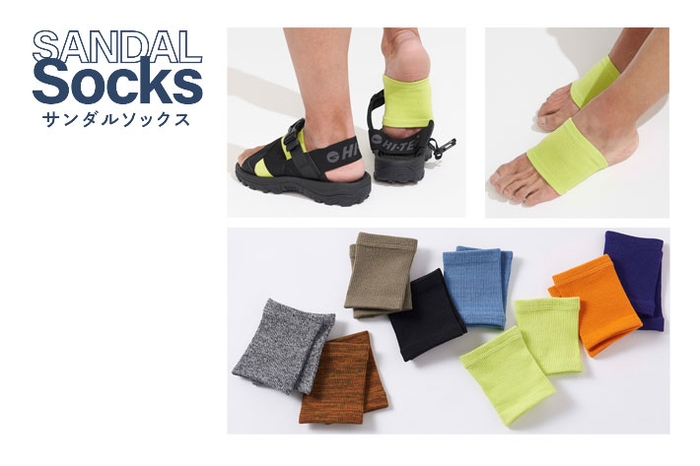 サンダル着用時の「足裏が汗でべたつく」「ストラップがあたって痛い」という悩みに対応したサンダル専用ソックス。サンダルやアウターに合わせやすいカラーバリエーション