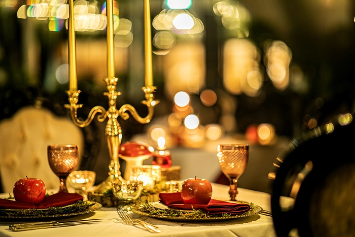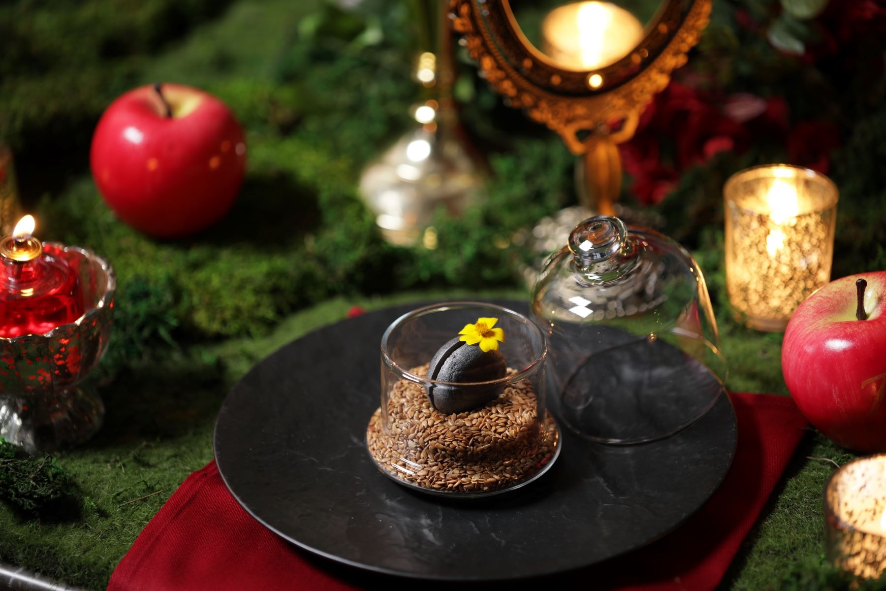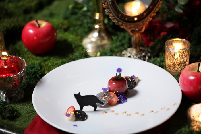 ストリングスホテル 名古屋の総料理長が監修した料理は白雪姫の世界観をさらに惹きたてます。総料理長一押しの“漆黒のニョッキ 猪のラグーと枝豆”は森の中を彷徨う白雪姫にインスピレーションを受けた一品です。デザートの“深紅林檎のドルチェDARK SHIRAYUKIHIME”は毒林檎をイメージした逸品です。