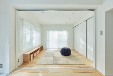 取外しが容易な「ダンボールふすま」と、可動式の「麻畳」を用意することで、使い方を変えられる空間をつくることができます。畳や押入を設けて布団での生活を想定することで、在宅ワークスペースを設けても日中ゴロンとくつろぐ居間を確保できます。