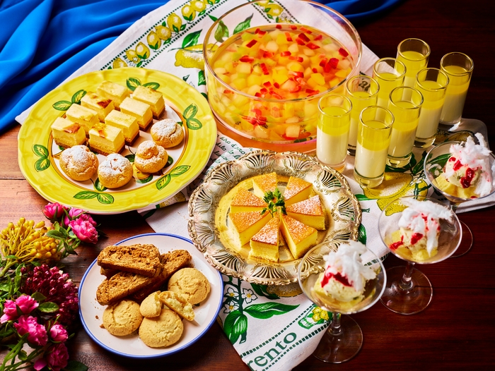パンナコッタ アランチャ(オレンジ風味のパンナコッタ)、シュークリーム、マチェドニア(イタリアンフルーツポンチ)、ペエーレ カラメリザーテ(洋梨のキャラメリゼ)他
