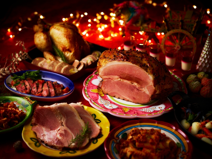 プロシュートコットのオーブン焼き はちみつとクローブの香り、ターキーのロースト 栗とソーセージ包み