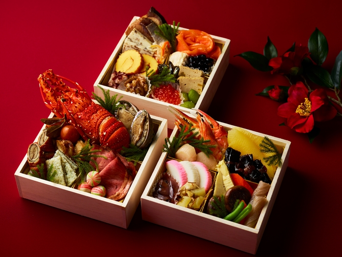3段おせち料理は、伊勢海老やローストビーフ、ずわいかに爪など