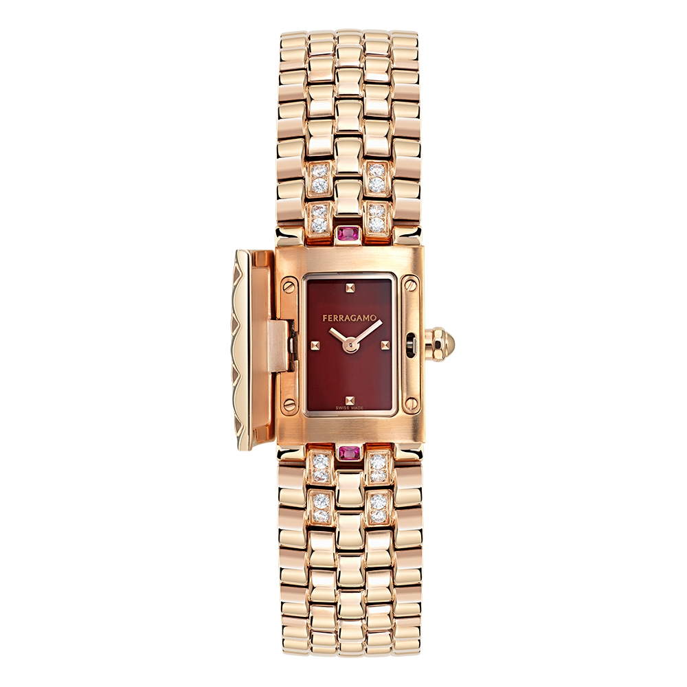縦にフェラガモのロゴが刻まれたモバイルパネルにも見られる5連ブレスレットの丁寧な細工が、このモデルをさらに引き立てています。文字盤のフレーム、針、インデックスにあしらわれた小さなスタッズは、メタル仕上げの光沢を想起させ、時計の外装と内装の美的な連続性を反映しています。