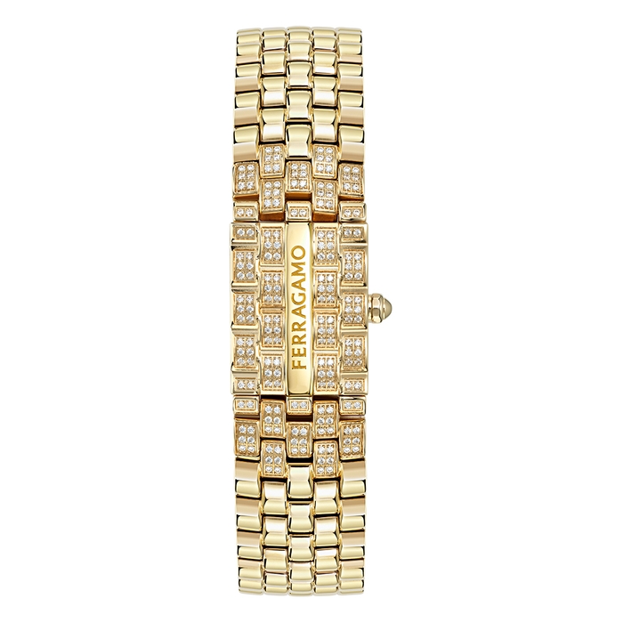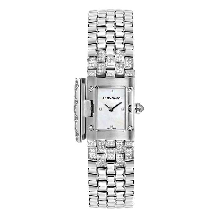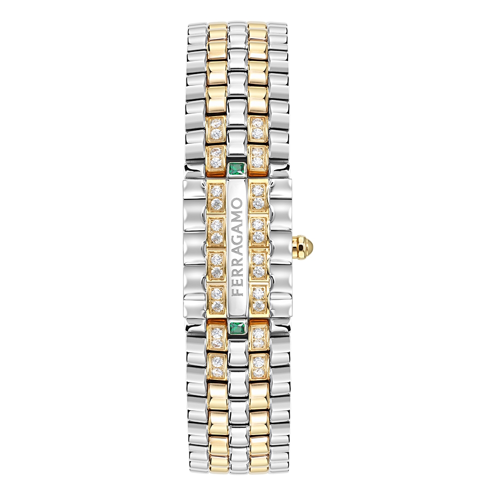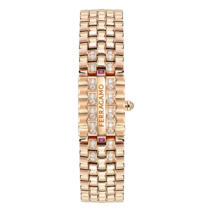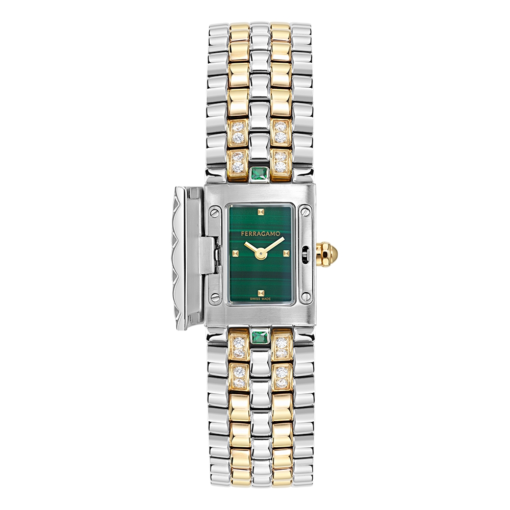 ● ケース: 長方形 18x30mm ● ムーブメント: クオーツ2針 (ロンダ1032) – スイス製 ● ダイアル: 4バージョン: ラピスラズリ/マラカイト/赤メノウ/マザーオブパール ● ブレスレット: 2バージョン:ダイヤモンド32個(0.96ct)とスクエアカットのブルーサファイアかエメラルドかルビー付きスティール/ダイヤモンド188個 (0.85ct)付きスティール – Ferragamoロゴ入りバタフライバックル ● 防水: 30メートル