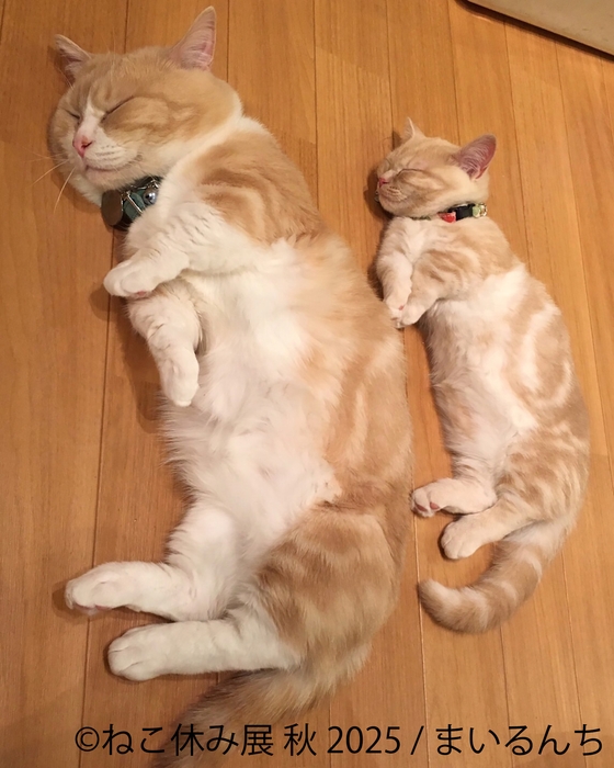 もふもふでとろけるような大きな北欧猫「しろあん(@shiroan_chan)」は、X(旧Twitter)で10万人以上のフォロワーを抱える人気猫。見る者すべてをほっこりさせる寝顔や愛くるしい仕草が、本展覧会で初披露されます。また、Instagramで約24万人のフォロワーを誇る「まいるんち(@yuriyuri4mama)」からは、短足でまんまるなお顔がチャームポイントの親子猫・まいるとじゅじゅが登場。お茶目な表情や心あたたまる親子のやりとりは必見です。さらに、寂しがり屋でマイペースな“あーにゃ”と、おしゃべり好きで活発な“びすけ”のコンビ「あーにゃ&びすけ(@a_nya.0606)」も名古屋会場で初披露!10周年を彩る新たなスター猫たちの魅力を、ぜひ会場でご体感ください。