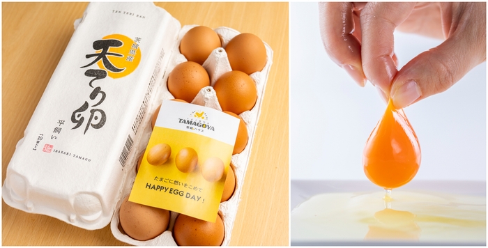 天てり卵を産む鶏は茨城県の緑が広がるのびやかな自然の中で、飲み水や餌、育てる環境にこだわり大切に育てられています。大切な贈り物のように貴重で、卵本来の美味しさと、「卵」という「生命(いのち)」の活力をお届けする卵です。茨城県を照らす太陽のような朱色の黄身が特徴的で、まるでわたしたちの食卓を照らしているよう。そのような想いも込めて我々はこの卵に「天てり卵」(てんてりらん)という名前を付けました。さらに弾力のある白身と濃厚な味わいの黄身が特徴で黄身は指でつまむことができるほどです。
