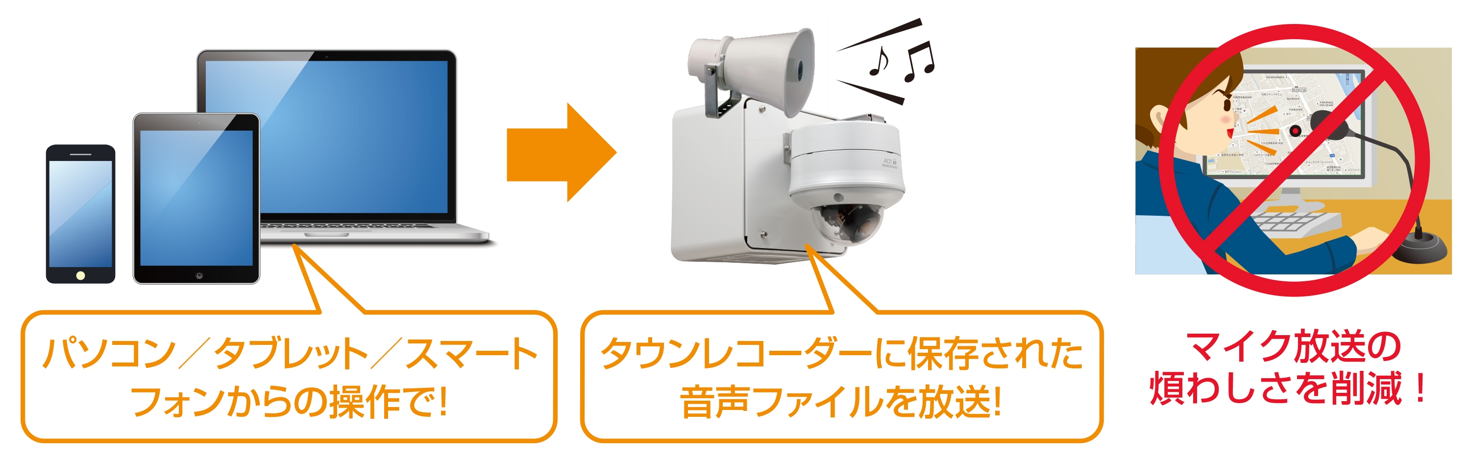 タウンレコーダーにあらかじめ保存しておいた音声ファイルの音源を、お持ちのWindowsパソコン・タブレット端末やスマートフォンでのボタン選択操作で再生するだけでアナウンス放送ができます。例え緊急時であろうと、発信者のスキルを問わず、迅速、かつ確実な情報伝達が可能となります。
