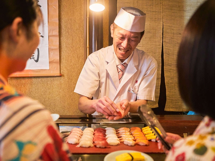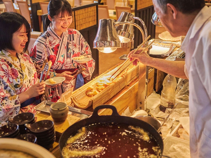 悠悠のバイキングは料理人が目の前で調理!お寿司や天ぷら、さざえの壺焼き、牛肉鉄板焼きなど、料理人がアツアツのお料理をご提供致します。