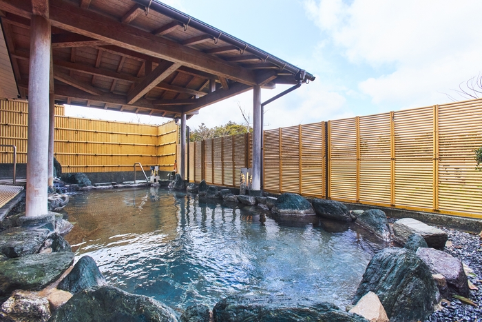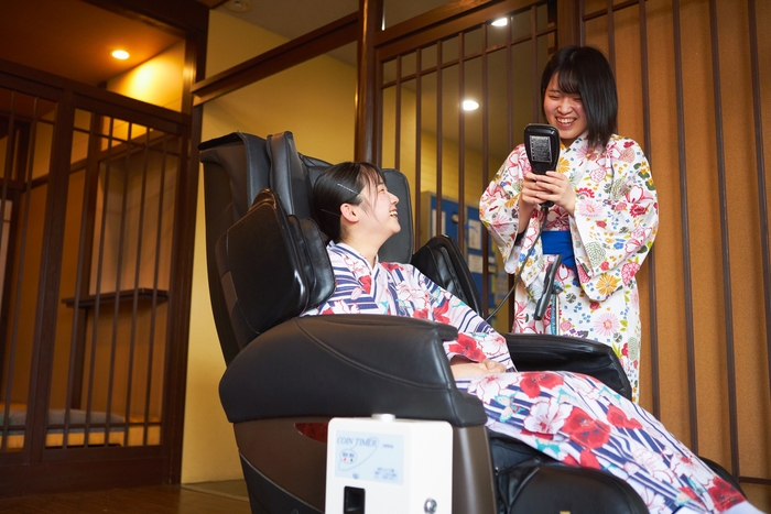 天然の「神の温泉」は、いつまでもポカポカして冷え症に効果的。自家源泉の大浴場には、男女それぞれに露天風呂、内湯を完備しています。お風呂上がりにはマッサージチェアで血行を良くするのもおすすめです。