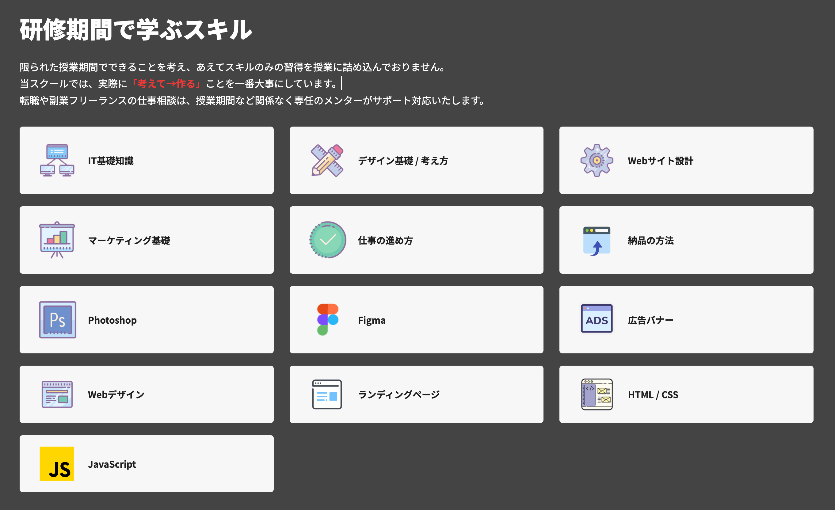 Webデザインとフロントエンド技術を学べる実践型スクール「クリエイターズファクトリー」を運営し、受講生一人ひとりのキャリア形成を支援しています。未経験からでもプロとして通用するスキルを身につけられる環境と、受講中・卒業後の制作実践支援が高く評価されています。近年では、企業向けの研修やデザイナー組織構築の支援事業にも事業を拡大しています。