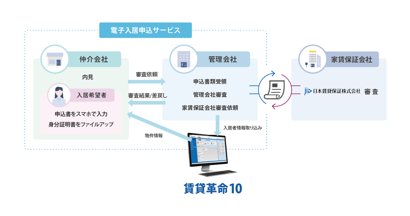 電子入居申込は、弊社が運用する業者間物件流通サービスと合わせてご利用いただく管理会社向けのサービスです。電子入居申込サービスを導入することで、入居申込のやり取りのほとんどをオンラインで完結させることができます。仲介会社とのやり取り等の業務負担を改善することができ、テレワークにも最適です。また、弊社が提供しているクラウド型の賃貸物件総合管理システム「賃貸革命10」と一緒にご利用いただくと、物件情報や入居者情報が連動しますので、不動産業務を更に便利に一貫して行うことができます。