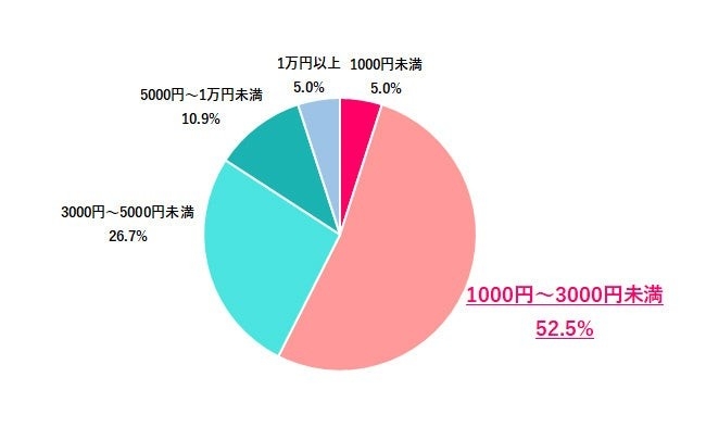 Q.7で手土産を持って帰ると回答した人に手土産の予算を聞いたところ、「1000円~3000円未満」52.5%で約半数を占めました。1000円未満も5.0%おり、約6割の人が3000円未満の手土産を選んでいることがわかります。