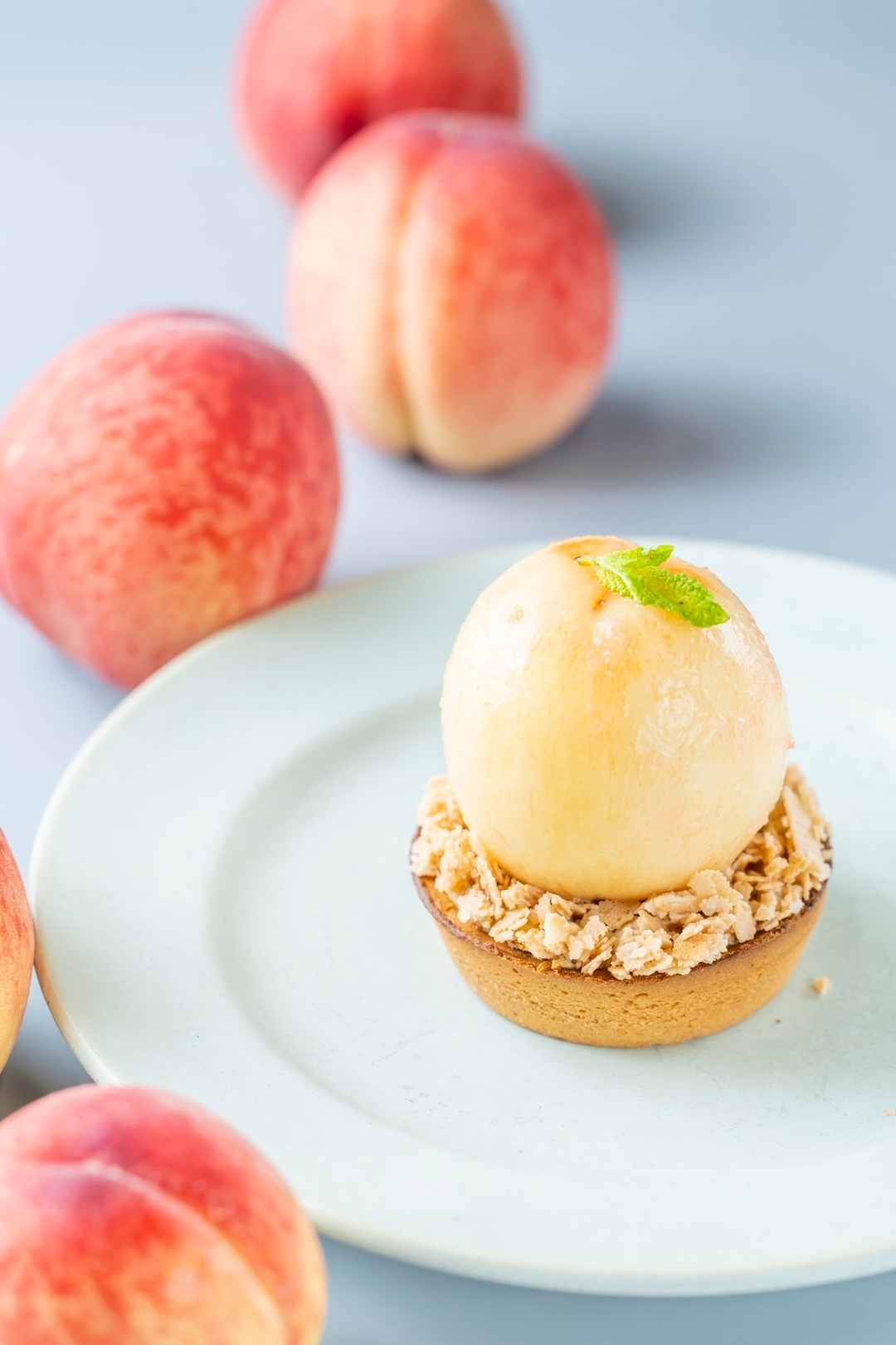 ブランマンジェの上に、桃の果肉・桃ゼリー・紅茶クリーム・スポンジ・生クリームを重ね、プラムソースとホワイトチョコクランチをアクセントにした、6層仕立ての華やかなパフェです。