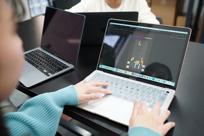 弘田:まずはYouTubeの動画を参考に、「テトリス」をつくってみました。参考になるコードを写していって、わからない部分は江崎さんたちに聞きながら理解していく。ほんのちょっとのミスでエラーが出て、自分の思い通りには動かなくなるので、プログラムを書いては直してを今でも繰り返しています。先輩たちのサポートがとても頼もしく、何度も助けてもらいました。