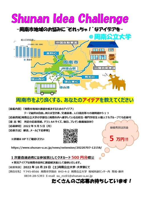 山口県周南市の周南公立大学は、2022の夏、「Shunan Idea Challenge-周南市地域のお悩みに”それっちゃ!”なアイデアを-」として、周南市地域の課題解決をするための「アイデア」を募集します。