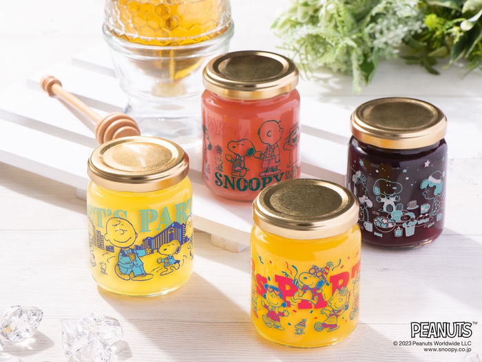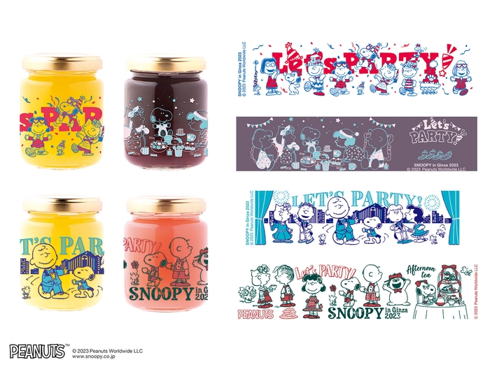 ピーナッツギャングたちがパーティーを楽しむ「スヌーピー in 銀座 2023」のイベントオリジナルアートをプリントした、キュートなガラス瓶入りのフルーツゼリー。