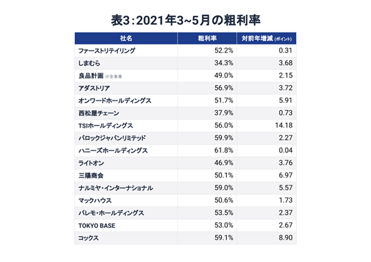 表3は各社の粗利率とその対前年増減を一覧にしたものだ。