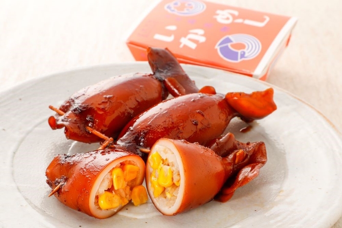 戦争中米不足であったため、スルメイカを用いて作られたものが最初。また開発時にはトウモロコシを米にまぜて作られていたこともあり、その当時のいかめしを今回再現しました。