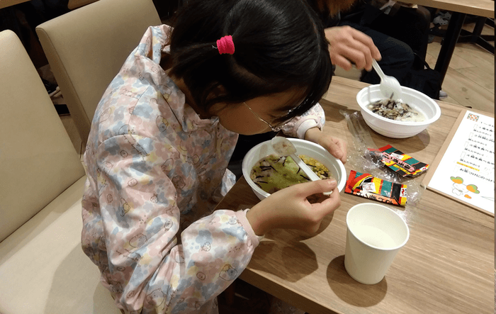 永谷園からは、朝食の大切さについてのお話とお茶づけの試食を行いました。試食の際には、「お茶づけに合うトッピング」を売り場で探し、多数決で選ばれた食材を実際にのせて食べていただきました。