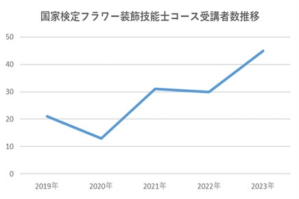 『ベル・フルールフラワーデザインスクール』では、「国家検定フラワー装飾技能士コース」を受講することが合格の近道になると口コミが広がり、年々受講生が増加しています。(下図グラフ参照:2020年は新型コロナウイルス感染拡大の影響で3級のみ開講により、数字が減少しています。)