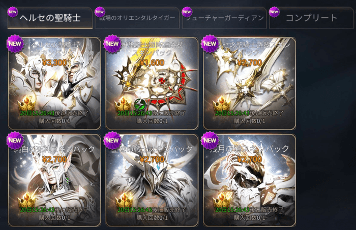 さらに、装備スキンをまとめた「神聖騎士団降臨武器スキンパック」と「ヘルセの聖騎士武器スキンパック」も販売!