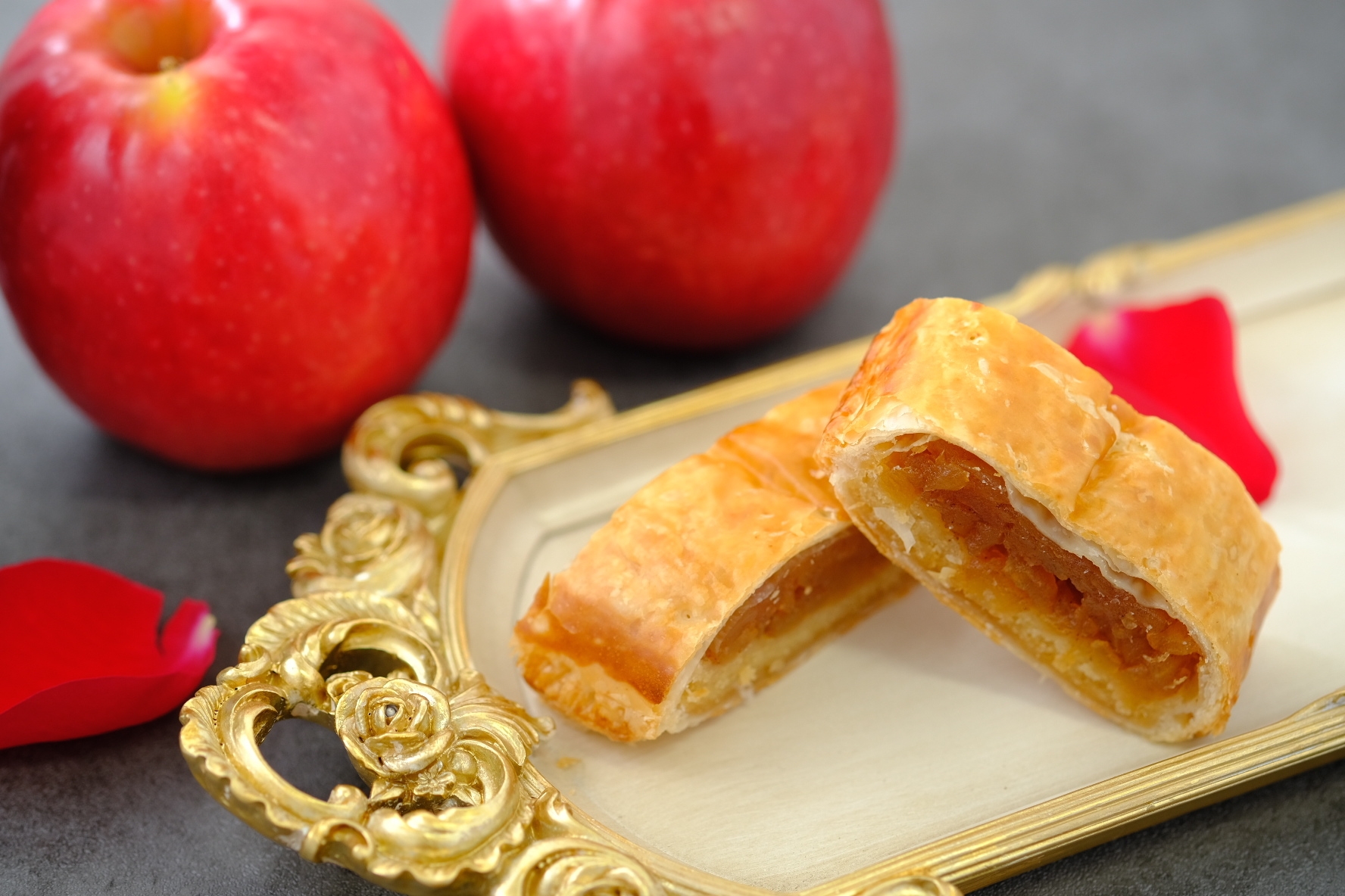 りんごをきび砂糖でじっくり煮詰めてジューシーなコンポートにし、薄めのサクサクとしたパイ生地にたっぷりと詰めました。