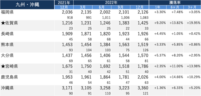 【九州・沖縄】 価格:「沖縄県」 3,360万円/騰落率:「大分県」 +5.37%