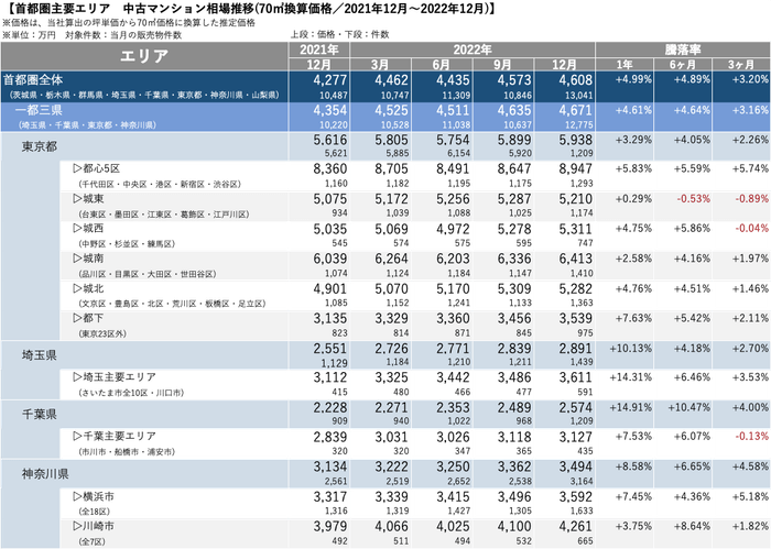「不動産×WEB×ビッグデータ」の領域で、さまざまな不動産テックサービスを展開する株式会社ワンノブアカインド(本社:東京都港区、代表取締役社長:川島 直也、以下当社)は、当社が運営しているマンション情報サイト「マンションレビュー」の保有データを元に、全国の2022年12月の中古マンション相場を調査。坪単価をベースに70㎡での価格に換算した「中古マンション価格」*1について、前年(2021年12月)からの推移を都道府県やエリアごとにまとめましたので、発表いたします。