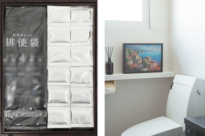 いつもはアートとして楽しめる本製品は、フレームの裏面を開けると、深さ4cmの収納スペースが登場。A3/A4サイズの2種類があり、A3サイズは非常用トイレ100回分(4人家族で約5日分)が収納できる大容量。いつもはトイレにアートとして飾っておけば、いざ水洗トイレが使えなくなった場合でも安心です。