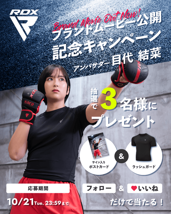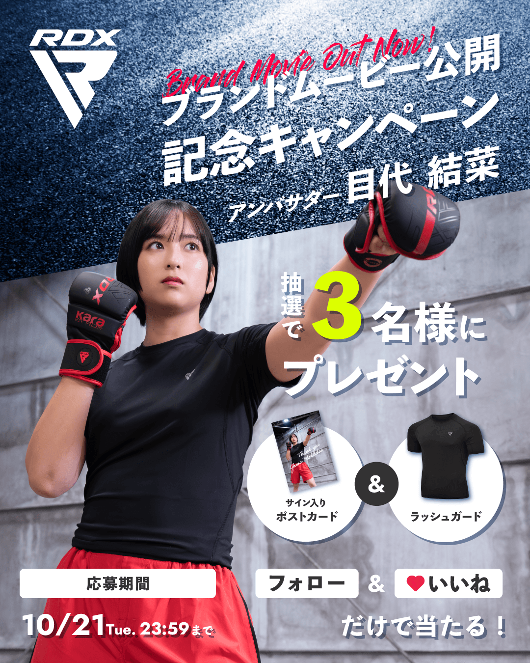 ブランドムービー公開を記念して、目代選手とのコラボキャンペーンも開催いたします。キャンペーンは、Instagram、Xにて開催します。Cycleが運営する「RDX JAPAN」及び目代選手のアカウントをフォローし、かつキャンペーン投稿を「いいね」(※Xはリポスト)するだけで参加できます。当選者には目代選手のサイン入りグッズやブランドムービー着用ラッシュガードをプレゼントいたします。すでに全てのアカウントをフォローしている方は「いいね」(※Xはリポスト)のみで応募することができます。期間は2025年10月14日(火)〜10月21日(火)23:59まで。当選者の発表はDMでお知らせします。