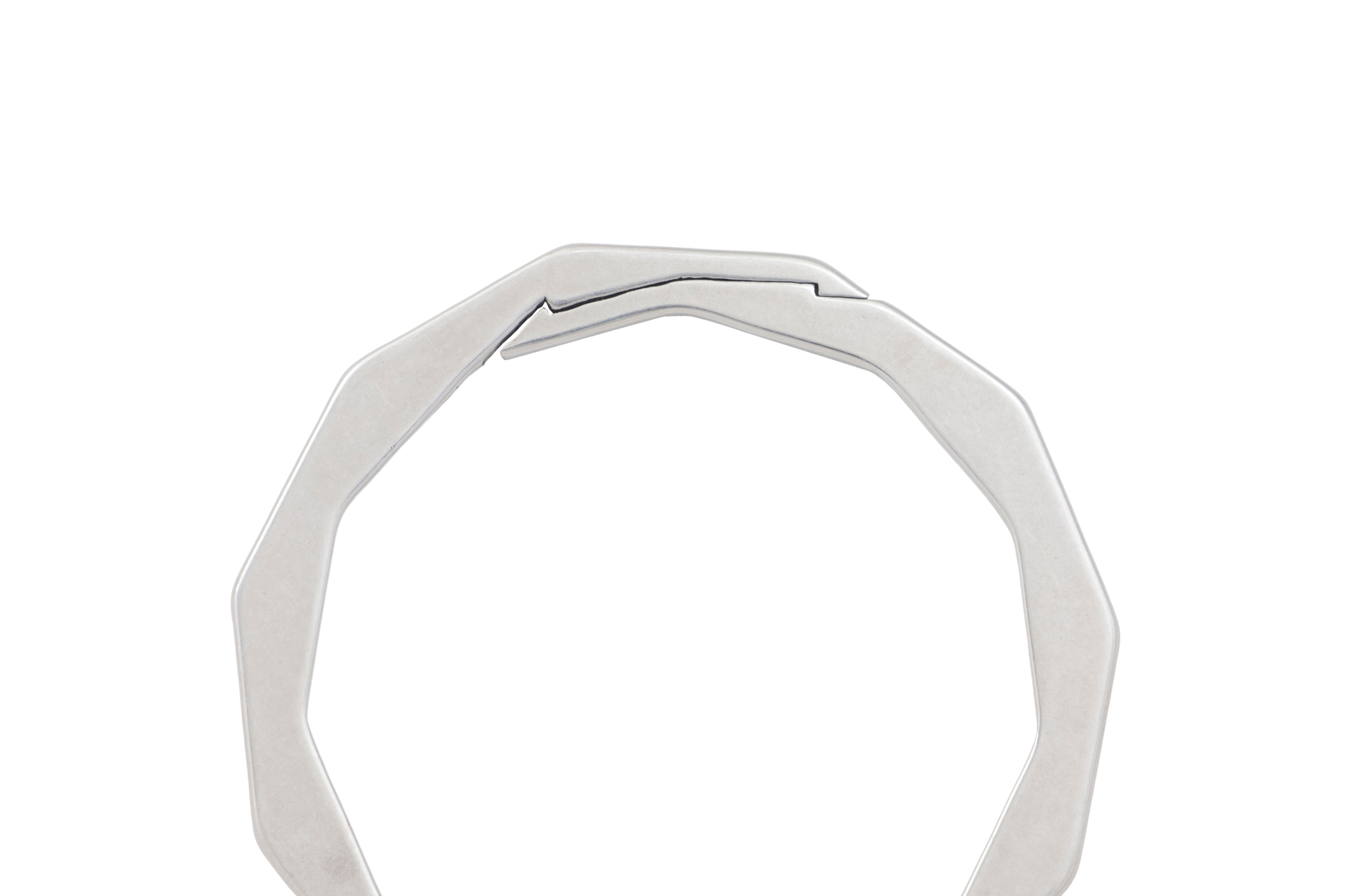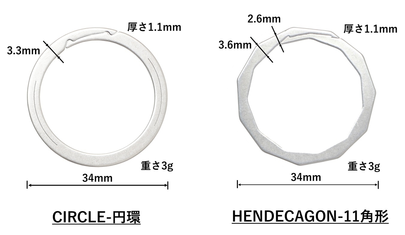 11角形タイプは、内角と外角の頂点が重ならないように設計されており、リングの幅に2.6〜3.6mmの差が生まれています。合わせ目に隙間を作る際には、幅が広い3.6mmの部分に指先を添えると力をかけやすく、スムーズに操作可能。鍵の取り外しを頻繁に行う方に最適なデザインです。