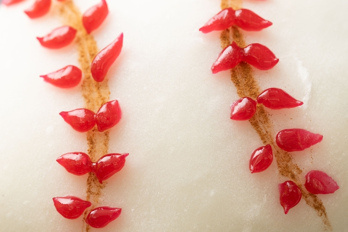 野球の硬式球とほぼ同サイズの「開運ジャンボホームラン大福」は、名物「いちご豆大福」3個分以上のボリューム感。縫い目は羊羹とニッキで再現しています。