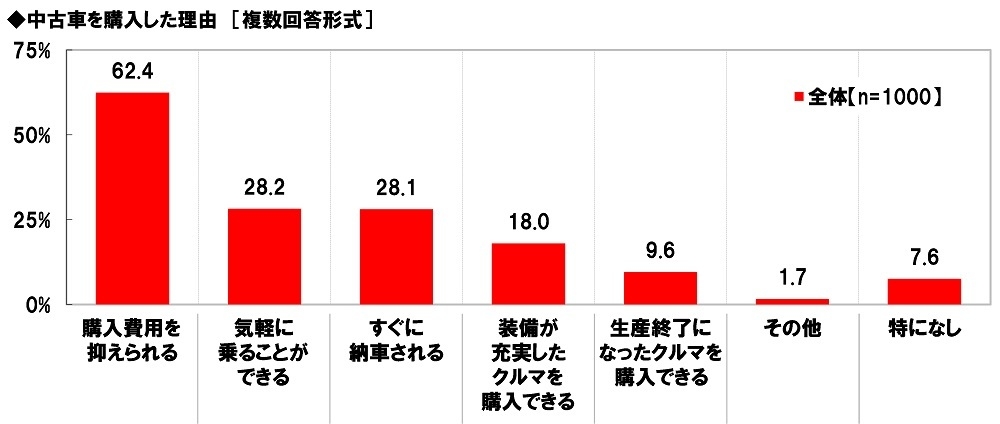 はじめに、全回答者(1,000名)に、中古車を購入した理由を聞いたところ、「購入費用を抑えられる」(62.4%)が突出して高くなりました。次いで高くなったのは、「気軽に乗ることができる」(28.2%)、「すぐに納車される」(28.1%)、「装備が充実したクルマを購入できる」(18.0%)、「生産終了になったクルマを購入できる」(9.6%)でした。