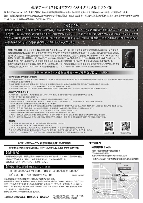 ※横浜みなとみらいホールは機能向上を目的とした改修工事を行うため2022年10月まで休館となります。これに伴い、期間中の横浜定期演奏会は会場・曜日・開演時間が変更となります。ご注意ください。