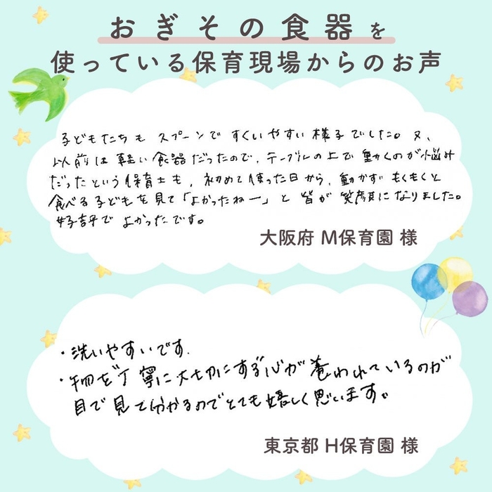 この『すくいやすい食器』で、子どもが自分で食べられる達成感が得られ、食事の時間が楽しくなったと、たくさんのお声をいただいています。