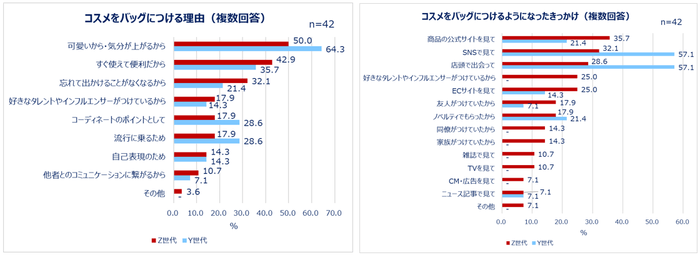 どんなバッグにつけているのかも聞いたところ、Z世代は「通学用(50.0%)」、Y世代は「お出かけ用(78.6%)」が1位に。つけているコスメの数はほとんどの人が1~2個でしたが、Z世代では5個、6個、11個以上という回答も目立ちました。