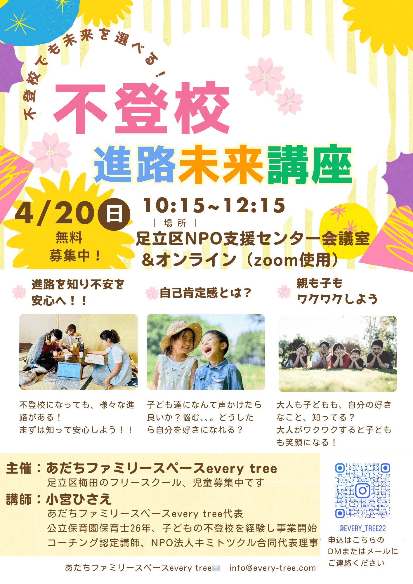 あだちファミリースペース every tree(代表:小宮 久恵)は、東京都足立区にてフリースクールを運営中。この度、不登校の小学生から高校生の保護者向け「不登校進路未来講座」を足立区NPO活動支援センター会議室およびZoomにて2025年4月20日(日)に開催いたします。
