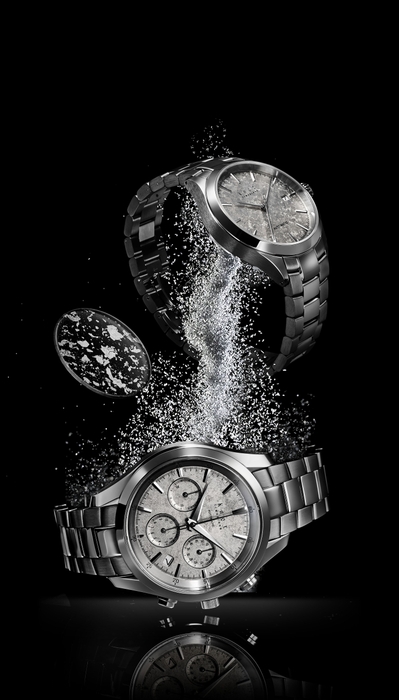 文字盤は一番目に触れる場所ですが、装飾が華美になると視認性が低下します。シンプルな意匠にしつつも素材の美しさを表現したい、というKnotのデザイナーと試行錯誤を繰り返し、最終的に採用となったのは「プラチナ箔」でした。プラチナ箔をフレーク状にした「切り廻し」を散りばめることで、箔の重なりが繊細な表情となって表現されています。また、ムーブメントの動きが見えるシースルーバックの三針タイプには、「散らし技法」が採用されています。こちらはサンプルを検討する段階で、箔一の実績であるゲラン社の香水ボトルやグラスウェア「Stardust」などにヒントを得てガラス素材との相性の良さが認められ採用となった技法です。