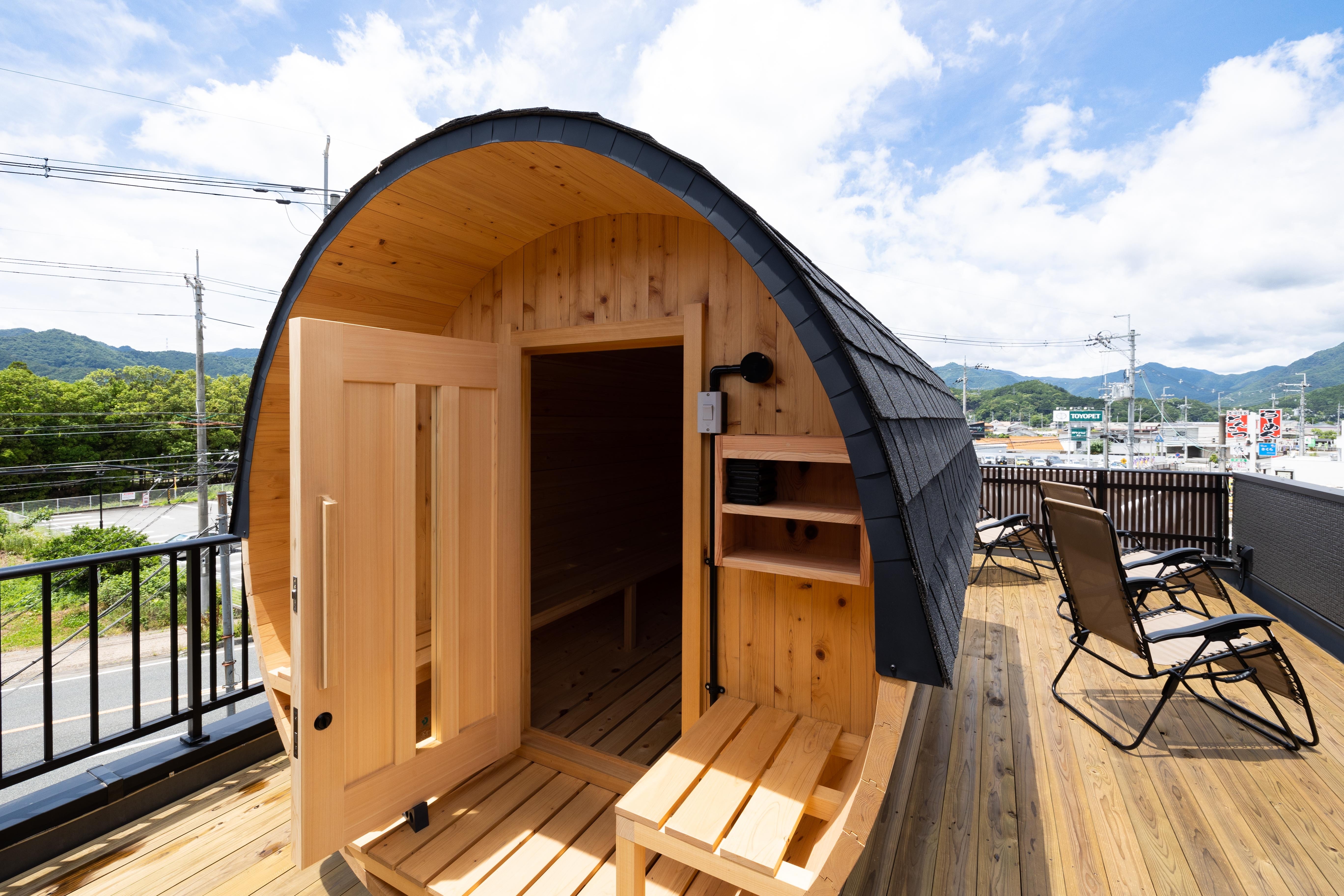 当施設は丹波市の中心に位置し、建物の屋上に建設された施設です。サウナはヒノキ仕様のバレルサウナで、木の温もりとヒノキの香りを楽しんでいただけます。ログハウス内には更衣室やシャワー室も完備され、水風呂が設置された外気浴スペースからは丹波の大自然を一望でき、当施設自慢の最高のロケーションをお楽しみいただけます。