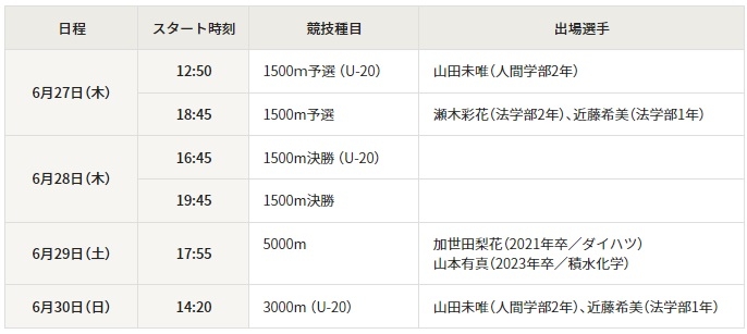 今大会は、8月に開催される「パリ2024オリンピック競技大会」の最終選考会を兼ねており、女子5000mには卒業生の加世田梨花選手(2021年法学部卒・現ダイハツ)と山本有真選手(2023年人間学部卒・現積水化学)も出場予定。U20は「リマ2024世界選手権」の代表選考会を兼ねており、いずれも世界に向けた挑戦になります。