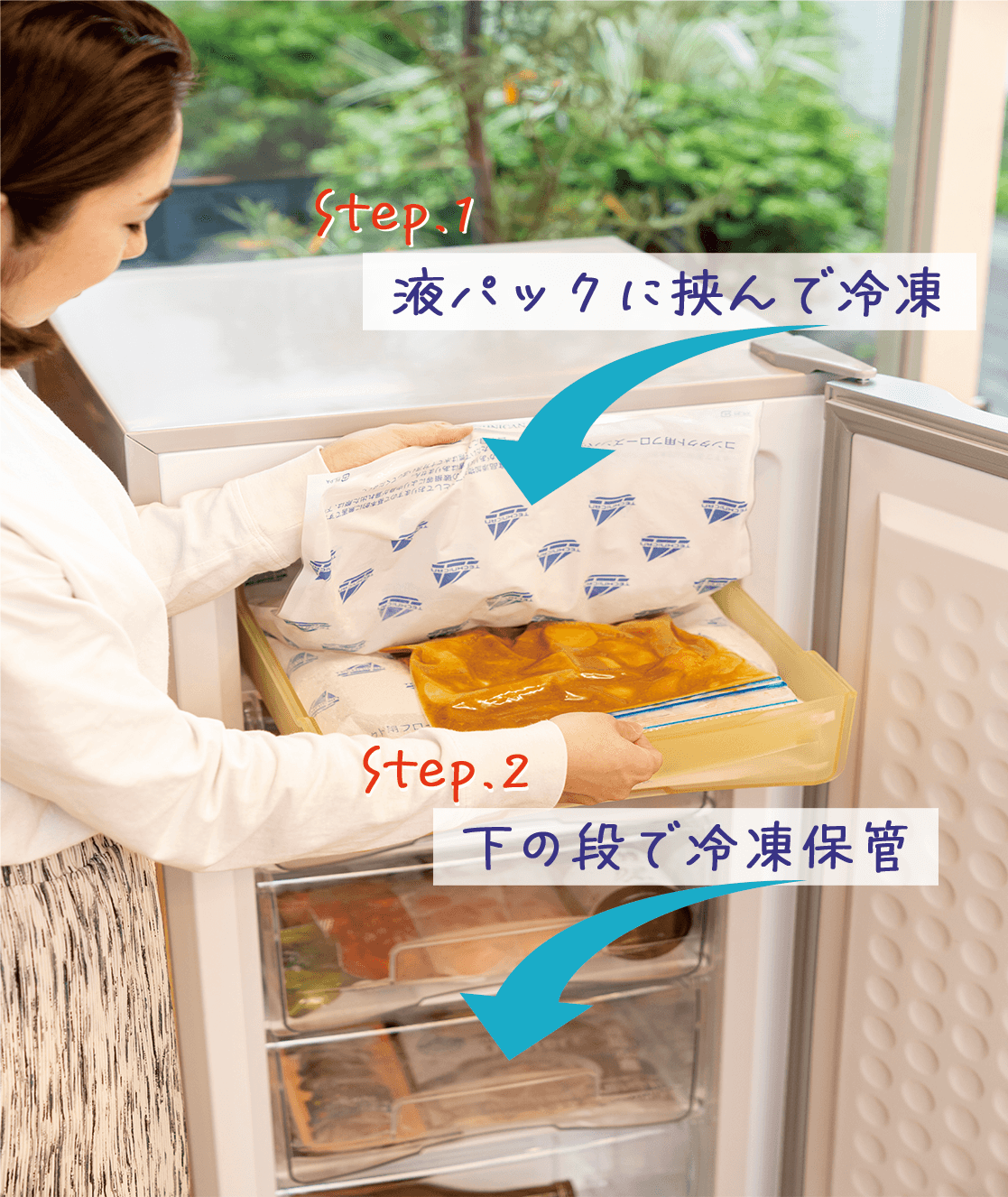 今回リリースする「凍眠マジック」は、氷点下でも凍らない液体をパックし、そのパックとパックの間に食品を挟み込んで急速冷凍する方式で、当社が特許を保有する機構です。業務用レベルの急速冷凍ができ、解凍後のフレッシュ感も凍結前と遜色ない品質です。液パックを使用し、温かい食品の温度を急速に冷蔵庫温度帯まで落とすことも可能。使い方次第で、急速冷凍、時短、食の安全の確保と1台で複数の役割を担えます。