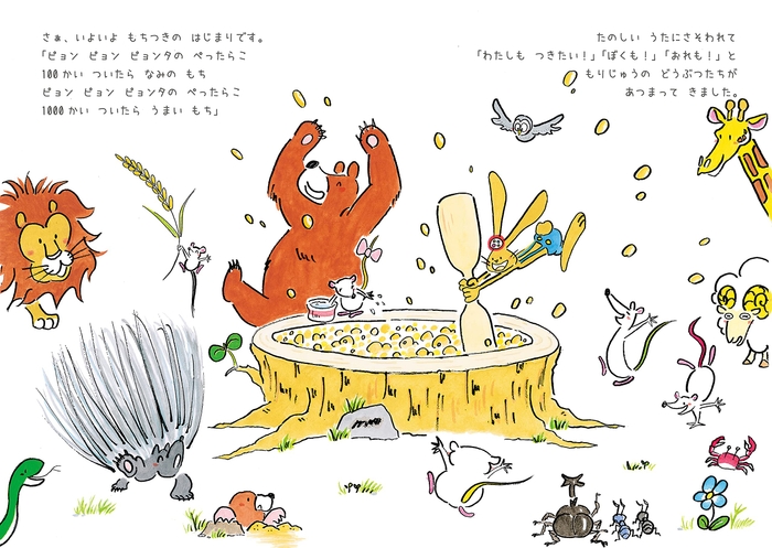 ピョン ピョン ピョンタの ぺったらこ。 みんなで ついたら うまい もち!