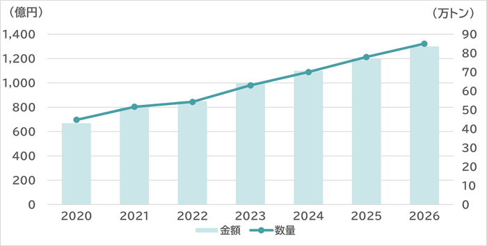 また、2023年の市場規模は約63万トン、1,000億円で、前年比15%増以上の大幅な成長になったと推定される。特にペットボトルの水平リサイクルが市場拡大の要因となっており、飲料メーカー各社がこの取り組みに力を入れており、今後も市場の拡大が予測される。