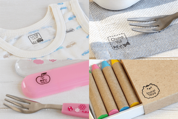 洗濯タグがないランチョンマットやコップ袋、マスク、靴下などにも名前つけ可能です。文具や食器にも押すことができ、食洗機にも対応しています。このスタンプ1本でさまざまなものに名前つけできます。