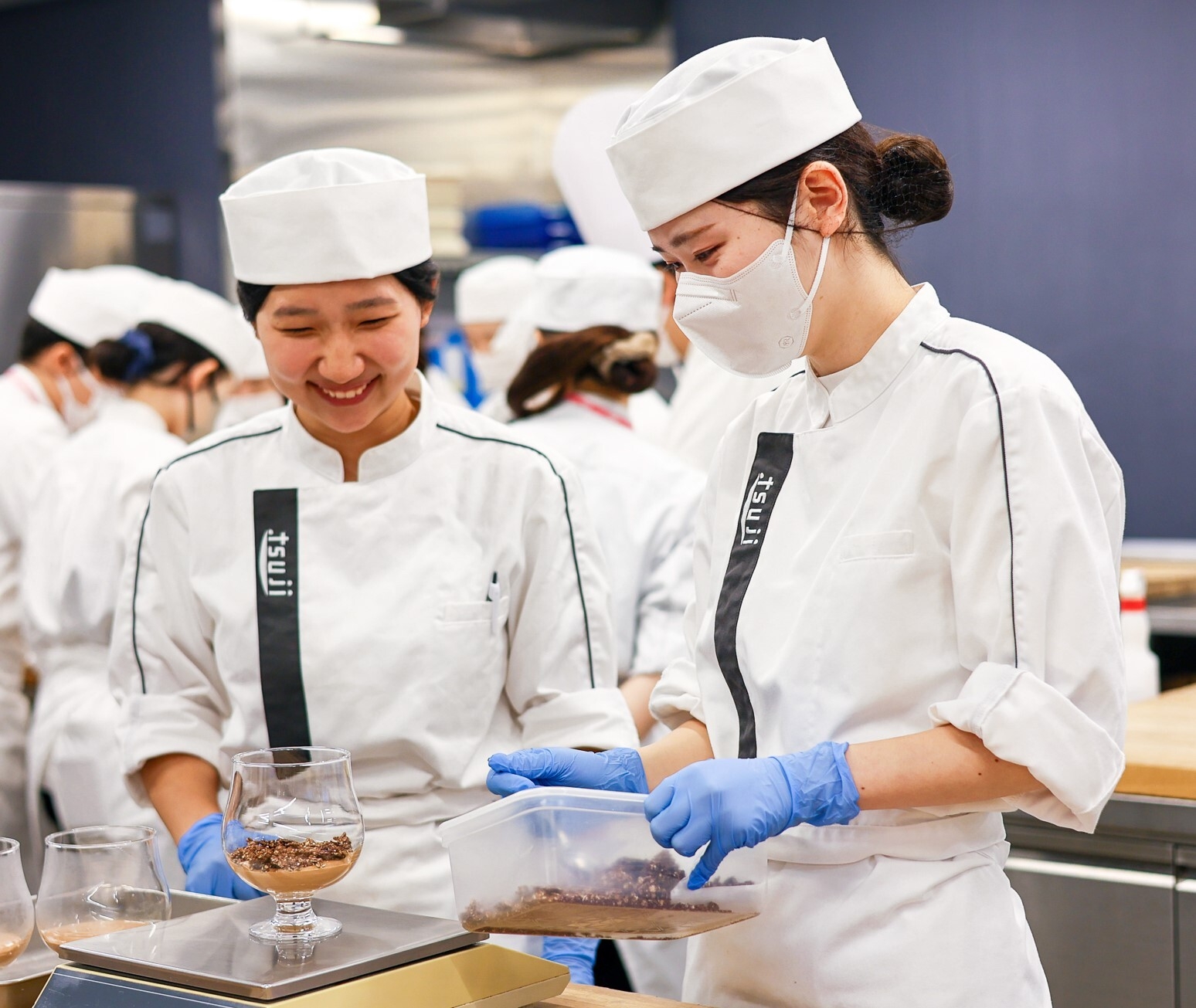 本年の注目ポイントは、あべのハルカスと同じ阿倍野区にある辻調理師専門学校製菓技術マネジメント学科の学生が初参加します。 企画へ志願した学生計18名が2チームに分かれ、3か月の試作期間を重ね、花束をイメージしたパフェ作りに挑戦。学生たちが自身でレシピを考案し、メニューをお客様に提供するのは初めてとなります。゛未来のパティシエ”たちの作品をいち早くお楽しみください。