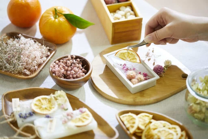 精油とドライした果実を使い、自分好みで飾り付けをして、アロマワックスバー(*)を作ります。見た目の可愛らしさはもちろん、いつでもだいだいの香りを楽しめるアイテムです。完成品は旅の思い出として、自宅に持ち帰ることができます。