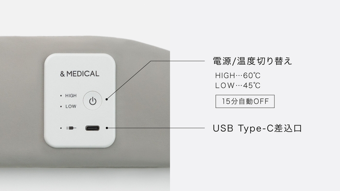 電源を入れたら、LOW(45℃)、HIGH(60℃)とワンタッチで温度切り替え。15分後に自動で電源オフするので安心です。USB Type-Cで手軽に充電できます。