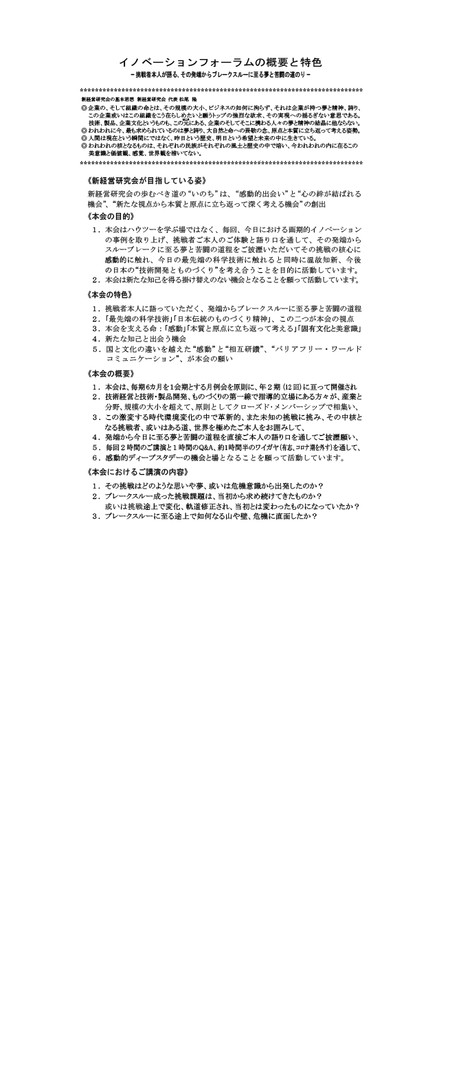 今年40周年を迎える日本の技術系幹部の相互研鑽の集まり「新経営研究会」(代表:松尾 隆)が主催する、「イノベーションフォーラム(月例会で1期6回)」の2021年度後期プログラムを東京六本木の「国際文化会館」にて2022年2月25日よりスタートいたします。