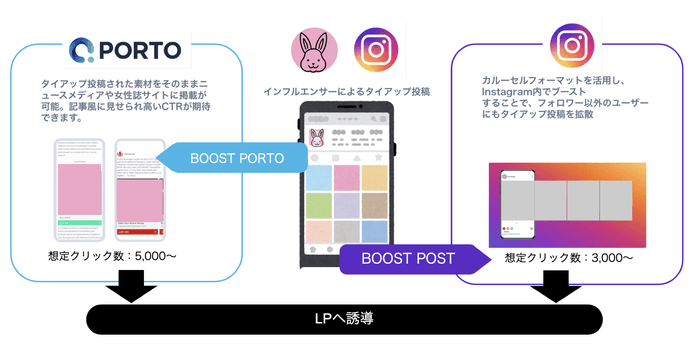「PORTO Influencer Booster」は、良質なインフルエンサータイアップ投稿をそのままブランド広告主向けアドプラットフォーム「PORTO」(https://portodsp.co.jp/)参画媒体に掲載できるソリューションです。